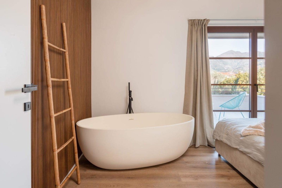 freestanding e ampio bagno ad uso esclusivo. La camera inoltre gode di una splendida vista sulle Alpi