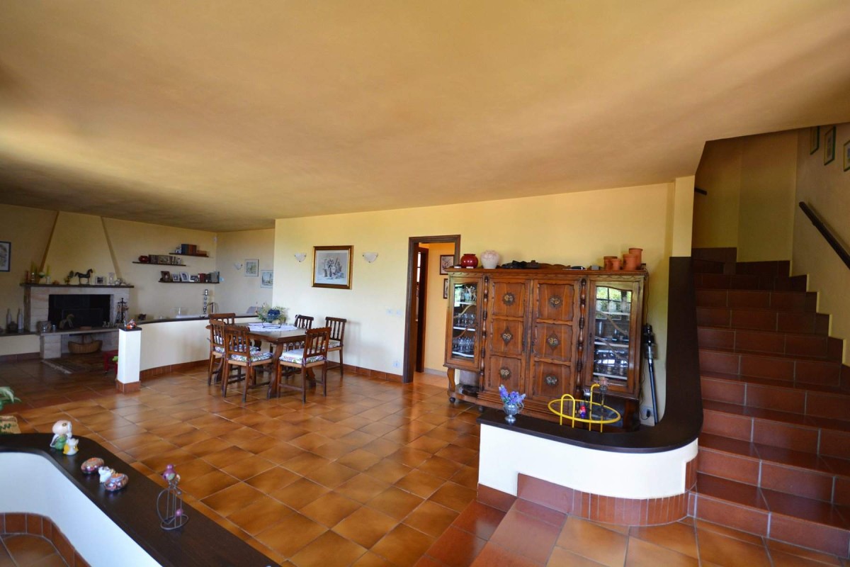 Il piano terra è composto da un grande ingresso, zona tinello, salotto con camino, una cucina con accesso diretto alla terrazza esterna con vista mare ed un bagno.