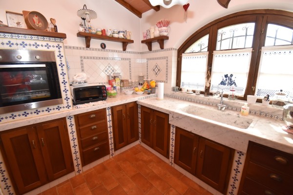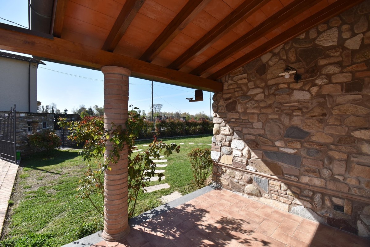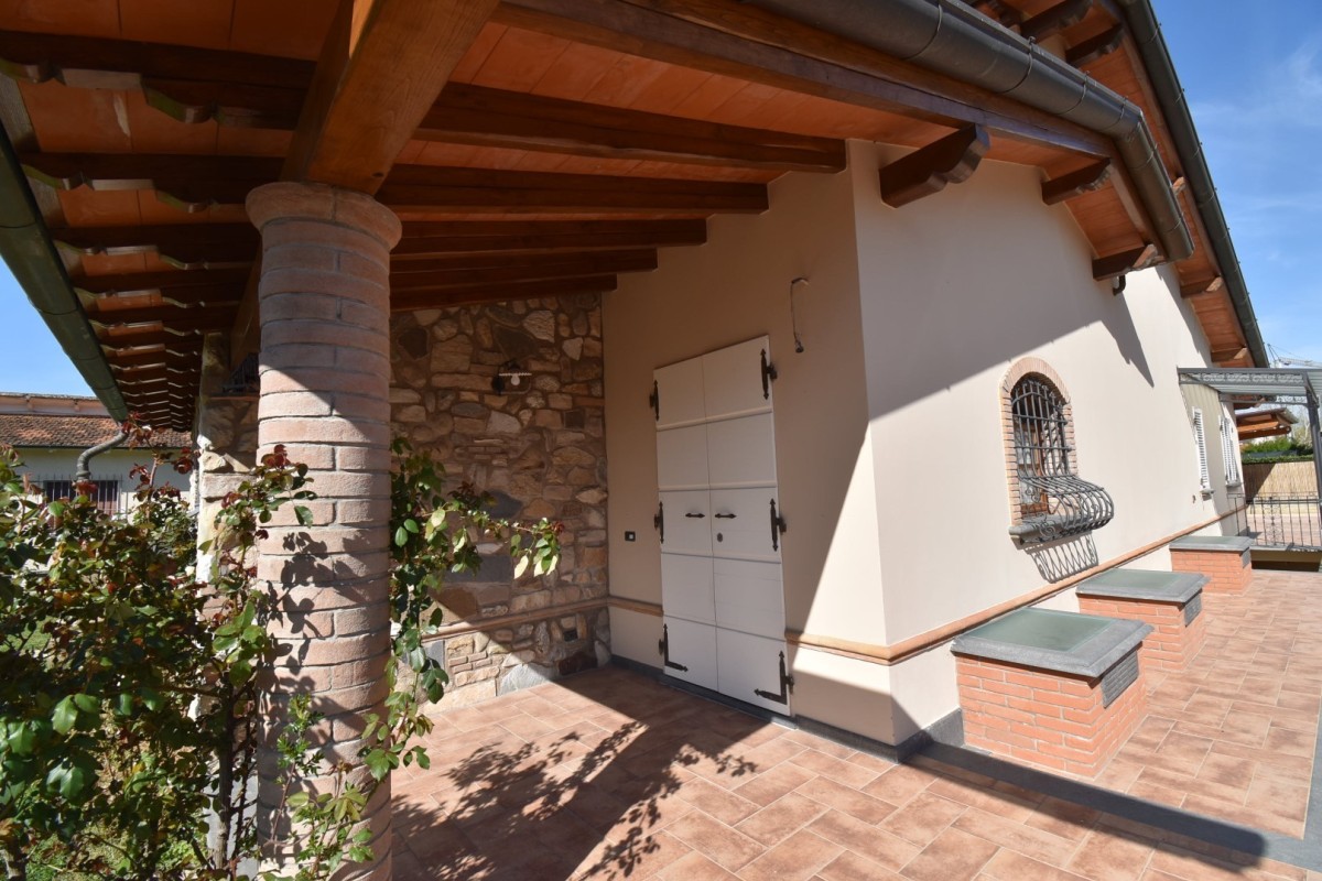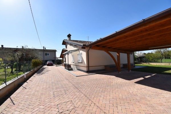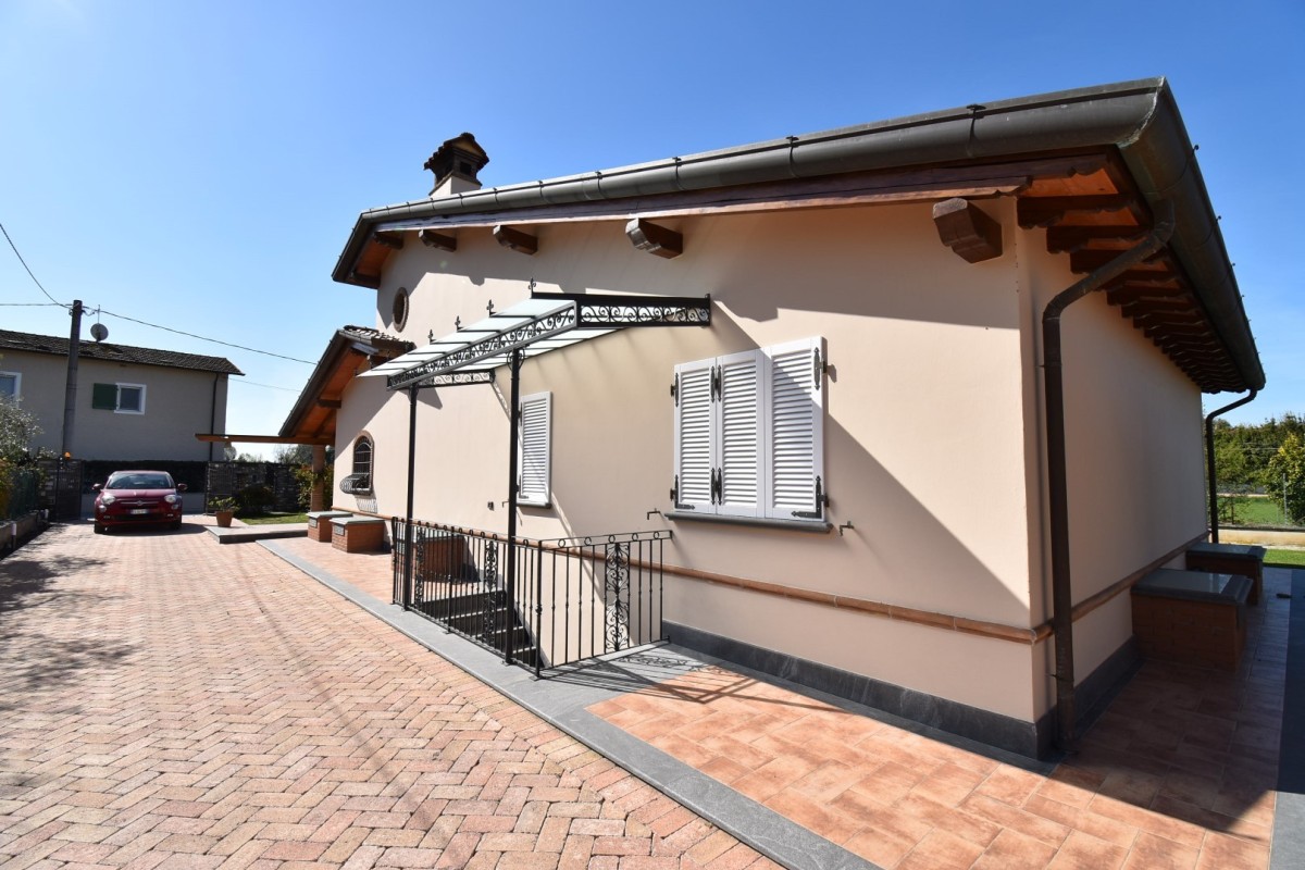Vendesi splendida villa singola in zona residenziale e tranquilla, prevalentemente di campagna, molto soleggiata. L'immobile si sviluppa su unico piano oltre seminterrato e sottotetto. Gode di ampio giardino sui quattro lati con accesso pedonale e carrabile dalla strada. Internamente si compone di: doppio ingresso su ampia zona giorno open space con angolo cottura, tinello e soggiorno con camino, vano ripostiglio, disimpegno su zona notte in cui si trovano: una camera matrimoniale, due camere doppie ed un bagno di servizio.